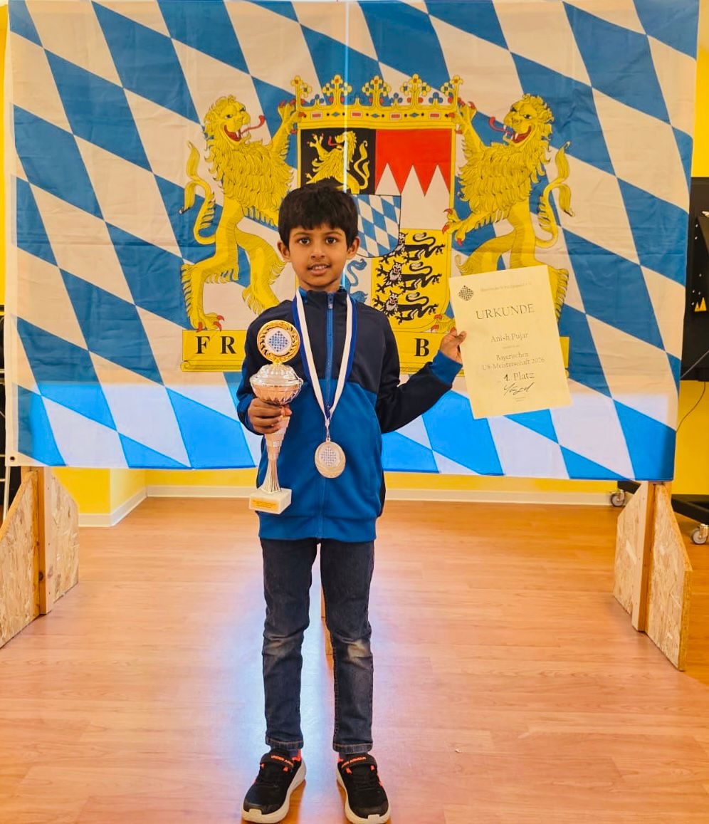 08.03.2026: Bay. Meister U8: Anish Pujar gewinnt bei der Bayerischen Einzelmeisterschaft U8 in Kronach mit 7 Punkten aus 7 Runden.