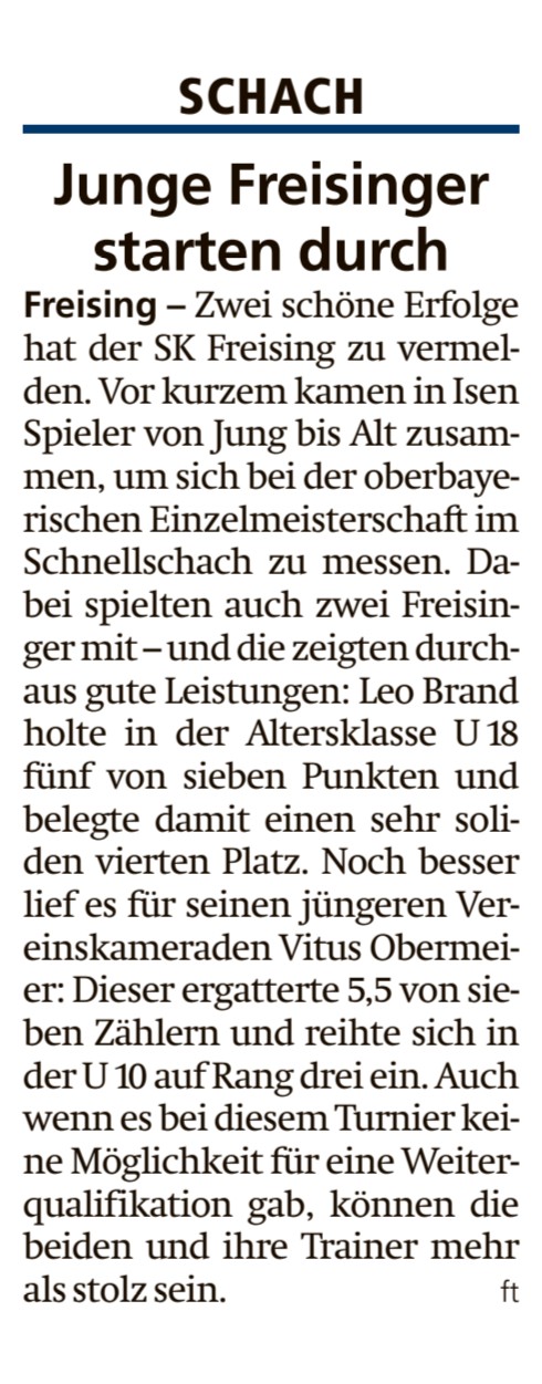 In der U10 belegte Vitus Obermeier den 3.Platz (5,5 Punkte aus 7 Runden; 16 Teilnehmer).